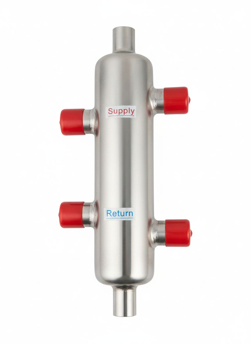 Hidravlik Balanslaşdırma: Qazan dövrəsini ("Supply" / "Return") istehlakçı dövrələrindən tamamilə ayırır. Bu, nasosların bir-birinə təsirini aradan qaldırır və təzyiq dəyişikliklərinin qarşısını alır.